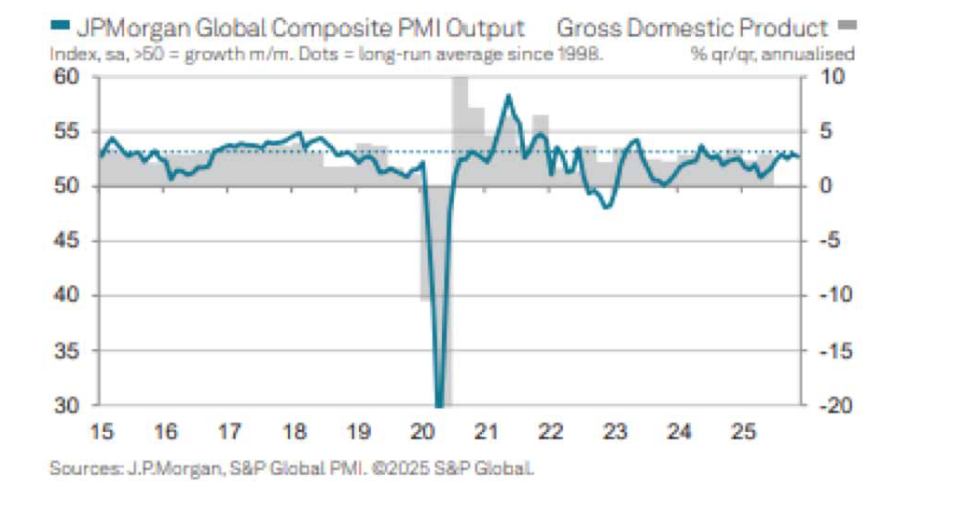 Indien liefert unverändert in Asien die stärksten Datensätze. Das US-Zollregime gegen Indien zeigt bisher nur geringe Wirkung. Indien geht auch im 1. Quartal 2026 Wege im eigenen Interesse. Die wirtschaftsfreundliche Grundausrichtung der Regierung Chinas stabilisiert den regionalen Ausblick im Hinblick auf die exogenen Herausforderungen. Weitere Zinssenkungen zur stärkeren Stimulanz sind im Hinblick auf den hohen positiven Realzins jederzeit möglich. Die Daten Chinas sollten vor diesem Hintergrund weiter von Stabilität mit positivem Grundton geprägt sein. Die in die Zukunft gerichteten Wirtschaftsdaten deuten in Richtung einer soliden Dynamik der Weltkonjunktur. Der von JP Morgan für die Weltwirtschaft ermittelte Einkaufsmanagerindex für die Gesamtwirtschaft (Global Composite PMI) signalisierte per November 2025 mit 52,7 Punkten einen hohen Indexwert Der Dienstleistungssektor trug dazu wesentlich bei.