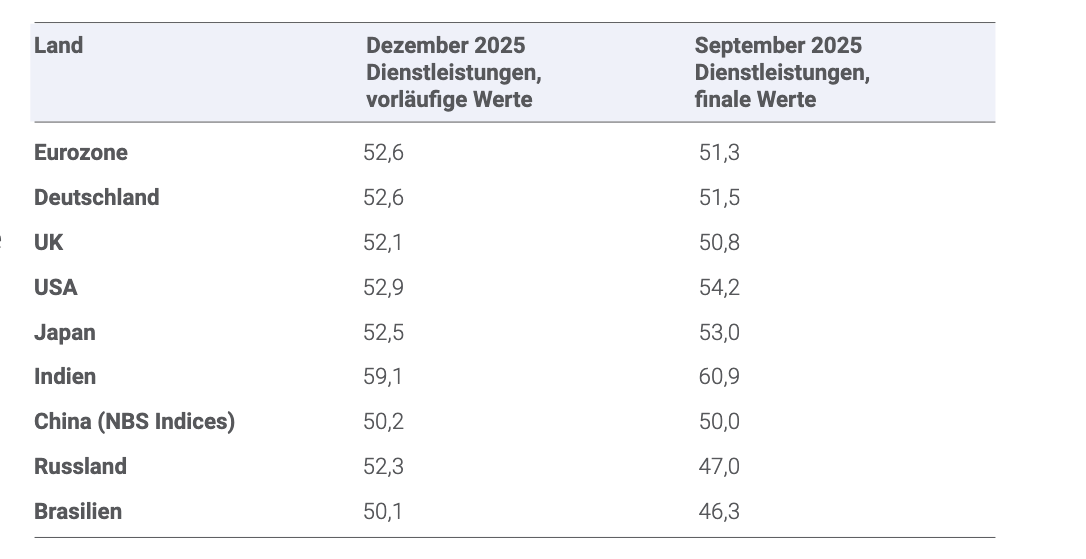 Der Dienstleistungssektor bewegte sich im 4. Quartal 2025 laut Einkaufsmanagerindices in einer Gesamtbetrachtung (Ausnahmen USA, Japan, Indien) im erhöhten Wachstumsmodus und sorgte für die gute Performance der Einkaufsmanagerindices bezüglich der Gesamtwirtschaft (Composite Indices).